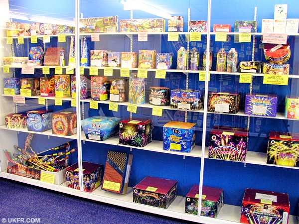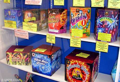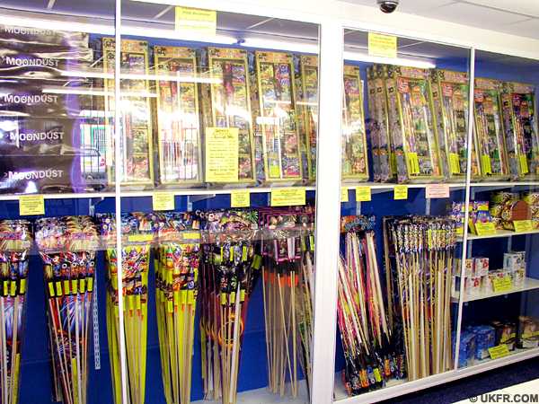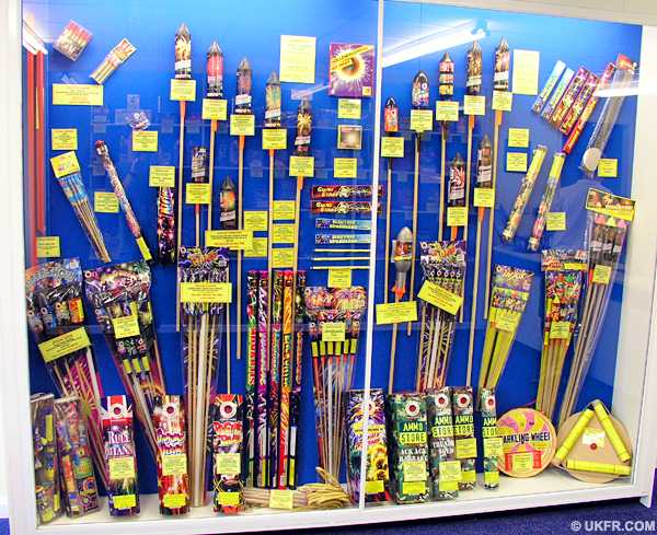 Fireworks range neatly displayed in glass cabinets. Effective
